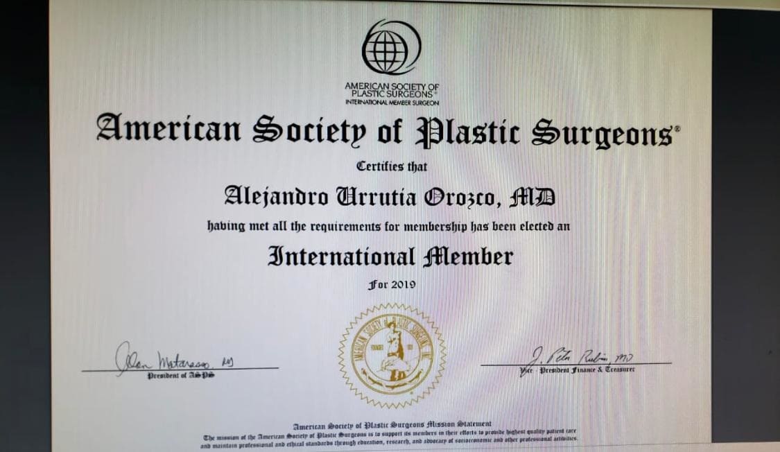 El Dr. Alejandro Urrutia Orozco es un cirujano plástico certificado por el Consejo Mexicano de Cirugía Plástica Estética y Reconstructiva (CMCPER) además de ser miembro activo y profesor de la Arbeitsgemeinschaft Für Osteosynthesefragen Craniomaxillofacial Division (AO CMF). Cuenta además con estudios de alta especialización (Fellowships) a nivel nacional e internacional en Cirugía Estética Facial (Coupure Centrum voor Plastische Chirurgie/ E:MC2, Ghent, Bélgica), Cirugía Plástica Pediátrica (Instituto Nacional de Pediatría Ciudad de México), Cirugía Craneomaxilofacial (GSR Institute of Craniofacial Surgery Hyderabad, India). Cuenta con certificación en E.E.U.U por el Educational Commission for Foreign Medical Graduates (ECFMG) además de aprovación del Step 3 por el Texas Medical Board.